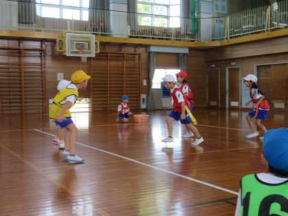 体育では、宝運び鬼をしています。最高得点のレインボースターを獲得するために、チームで協力しながら取り組んでいます。互いに声を掛け合い、よりよい作戦を見いだそうとする子供たちです。