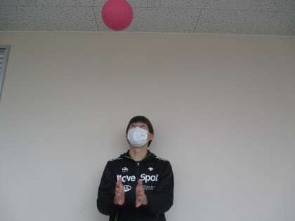 きょうのうんどう!ボールをつかったうごきです。ボールをもってしっかり立ちます。ボールをま上になげ、おちてくるまで手をたたきます。おちてきたボールをとります。ボールをなげてとるまでなんかい手をたたくことができるかな。