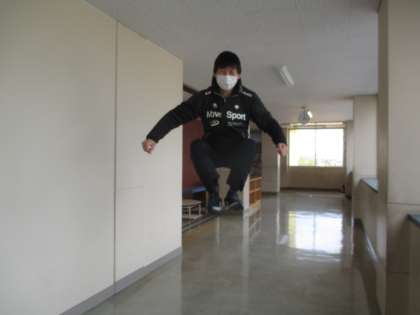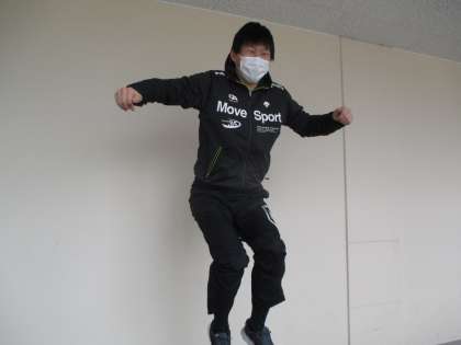 きょうのうんどうは、とぶ・はねるうごきです。まわりにあぶないものがないかをかくにんしましょう。まずはまっすぐに立ちます。そのばで、たかくジャンプをします。ジャンプをして、ひざを上げたり、足をひらいたりしてみよう。どんなジャンプができるかな?