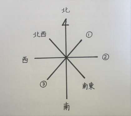 しゃしんの方位記号の1〜3に当てはまる方角を答えましょう。