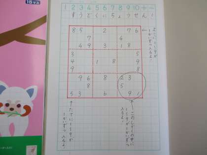 きょうは、数独(すうどく)をしょうかいします。たてよこ3マスのブロックにくぎられた たてよこ9マスの□の中に1〜9までのすう字を入れるパズルです。たしざんのれんしゅうにぴったり!じ学ノートにもできますね。