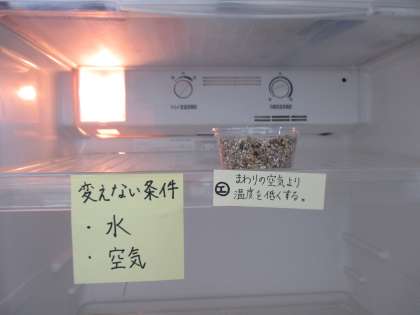 水と発芽、温度と発芽、空気と発芽について調べます。