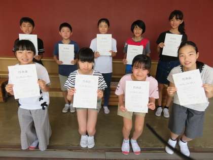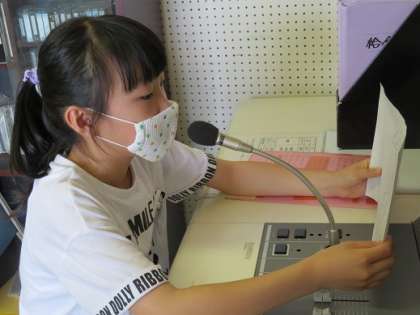 昼の放送を通しての児童会スローガン発表では、緊張しながらも全校のみんなにスローガンに込めた思いを伝えようとしていました。