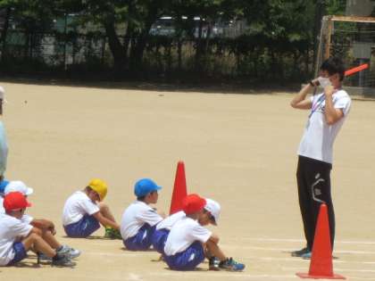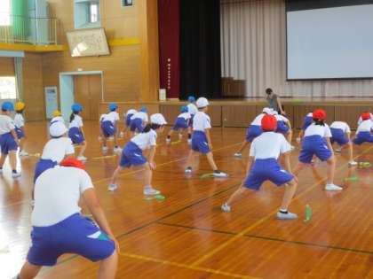 今日の2年生の体育は、1組が体育館、2組がグラウンドで行いました。間隔を空けて接触がないような学習を選んで行っています。子供たちは、体を動かすことができて、楽しそうです。