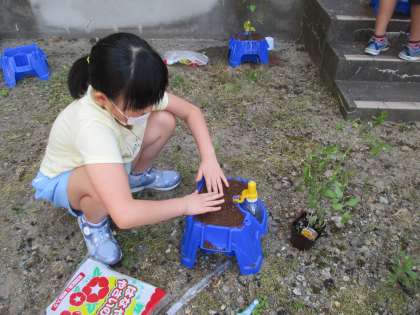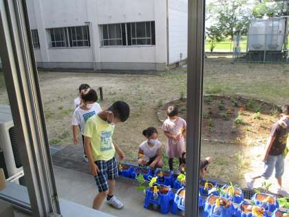 野菜の苗を植え、お世話を始めました。準備やこれまでのお世話等のご協力ありがとうございました。「たくさん実ができてほしいな。」「早く大きくならないかな。」と、早くも収穫を楽しみにしていました。水やりをしたり、観察したりする中で、考えたり発見したりすることを楽しんでほしいと思います。