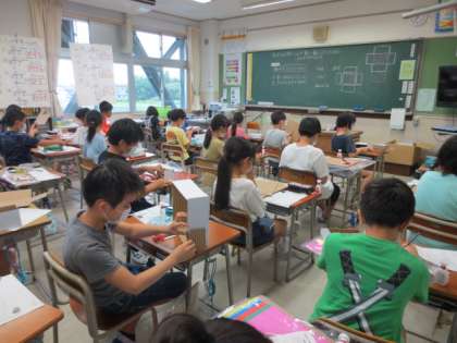 図画工作の授業です。設計図を見ながら自分の思い通りの箱になるように作りました。