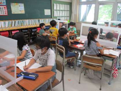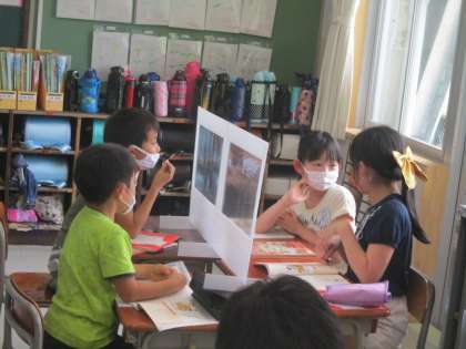 国語科「もっと知りたい、友だちのこと」では、友だち同士で知りたいことを考えて、質問をし合う学習を進めています。グループで質問をし合うため、机の真ん中には透明なついたてを立てての活動です。