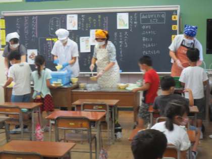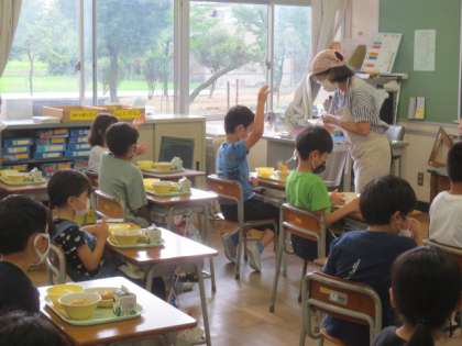 低学年の給食の盛りつけは、調理員さんと教職員が手伝っています。安全に配膳できるように、十分気を付けています。