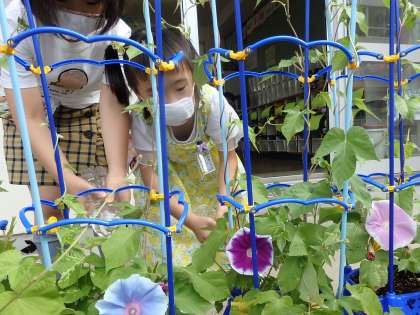 つぼみや花を見つけたり、つるが伸びたりしている様子に、大喜びです。