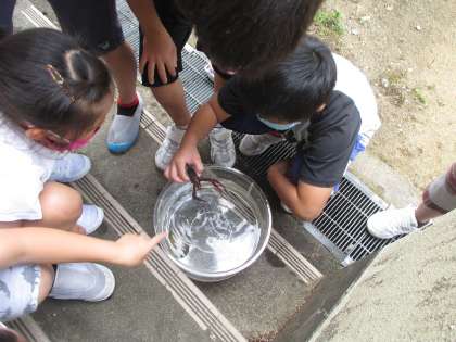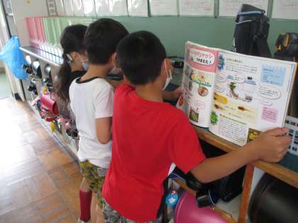 生活科で飼育している、ザリガニ、オタマジャクシ、ヤゴ、ダンゴムシ等のお世話をしている写真です。一日に何度も様子を見に行ったり、図鑑を見ながら観察したりする子供もいます。生き物に名前を付けている様子も見られ、子供たちの微笑ましい姿が見られます。