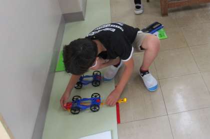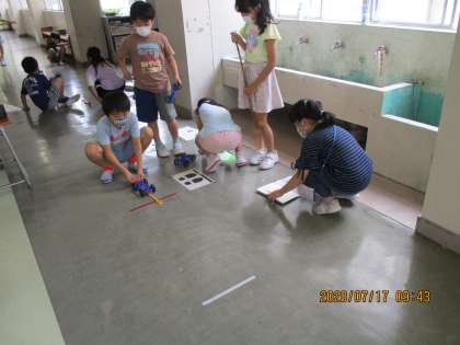 理科では、風やゴムの働きを学習しています。今日は、ゴムの伸ばし方を変えると、車の動く距離はどうなるのかを調べました。グループの友達と役割を決めて、協力しながら実験を行いました。