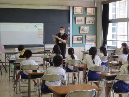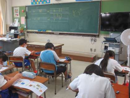 3年1組は、視聴覚室で外国語活動をしました。カードを見て、単語をすらすら言うことができました。3年2組は、ローマ字の学習です。正しくアルファベットを書くことができました。