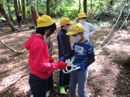 森の中で、ワイルド遊びをしています。班のみんなと協力して、準備をしています。