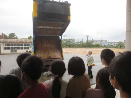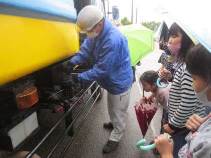 また、収集車(パッカー車)も見学させていただきました。目の前で収集の様子を見て、その迫力に子供たちからはどよめきの声が起こっていました。