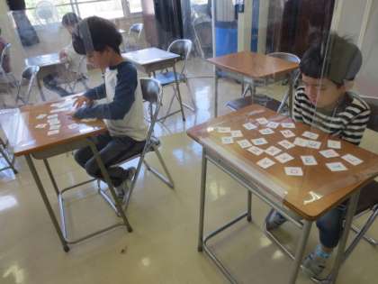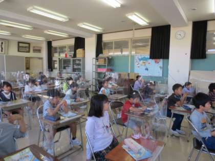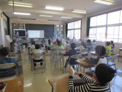 外国語活動では、口元を見て発音をしたり、子供たちの発音の仕方が正しいか教師が確認したりするために、一人一人に透明な仕切りを付けています。