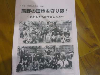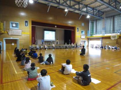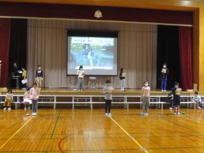 4年生は、「学びの発表会」で熊野の環境について調べたことを発表します。今日は、体育館で学年一緒に練習をしました。