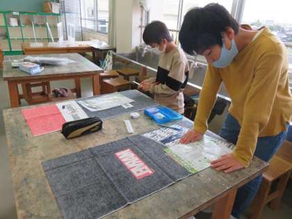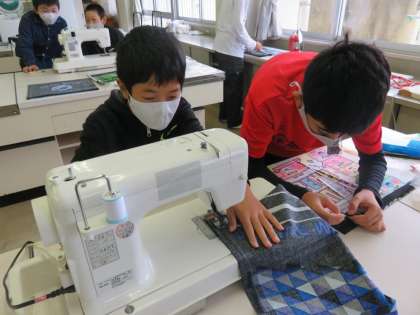 家庭科では、ミシンを使ってクッションやナップザックを作っています。去年の学習を思い出しながら、自分たちで説明書をよく読んで製作を進めています。