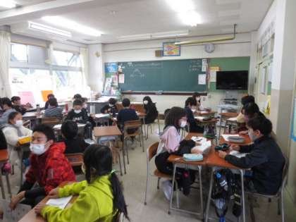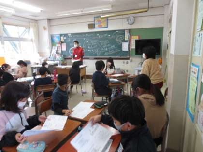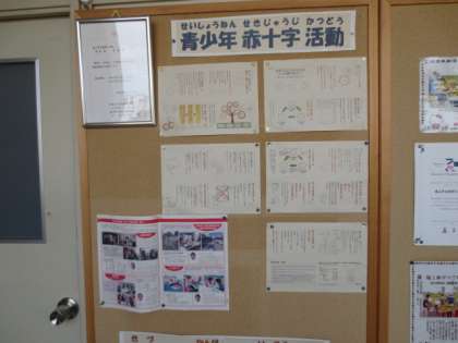 5年3組では、不安になっても差別するのではなく、落ち着いて自分でよく考えて行動したいと発表しました。日本赤十字のコーナーを作り、学習したことを掲示しています。