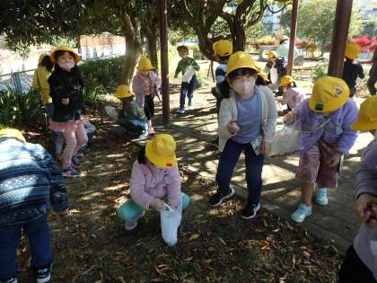 学校にはない、イチョウの木やドングリを見付け、大喜びの子供たち。