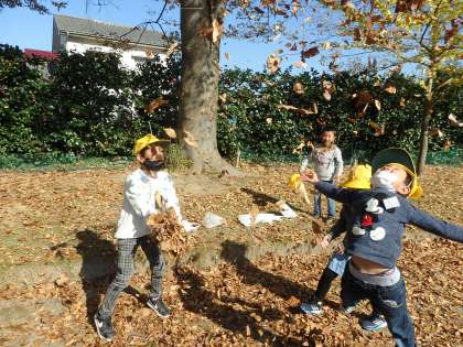 また、たくさんの落ち葉を使って、葉っぱのシャワーやお布団を楽しみました。