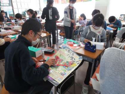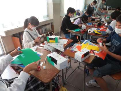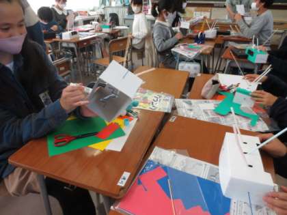 6年1組は、クランクの仕組みを生かして工作をしています。グループになって互いの作品を参考にしながら工夫して作りました。
