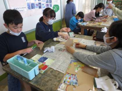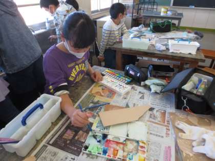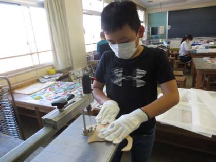 5年2組は、糸鋸を使って木版を切り分けていました。できた木片に色を塗ったり、組み合わせたりしてデザインをします。できあがりが楽しみです。