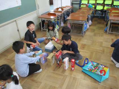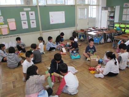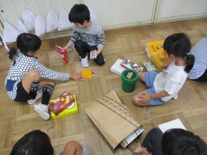 班の友達と関わりながら、みんなで持ち寄った箱を使って、組み合わせたり重ねたり転がしたりと、たくさん遊びました。