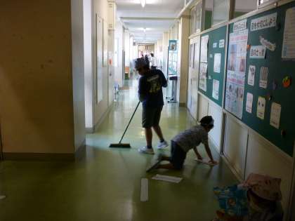 なかよし班清掃の様子です。班のみんなで協力して、それぞれの担当場所をきれいにしています。