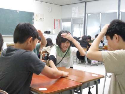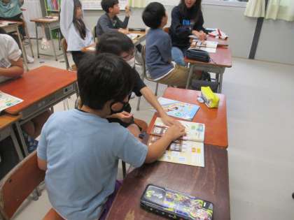 今日は外国語活動の時間に、身の回りにある筆記用具の英単語について学習しました。消しゴム1個と10個では発音が違うことに気付き、真剣に先生の発音を聞く様子が見られました。友達とカルタをしながら、英語に親しみました。