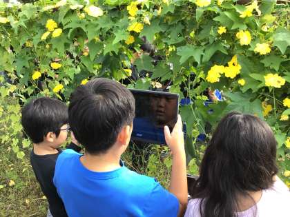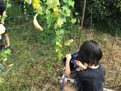 4月から観察を続けているヘチマを観察してきました。前回観察した夏休み明けに比べ、花が増えていたり、実ができていたりと様々な変化に気付きました。