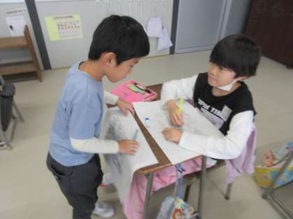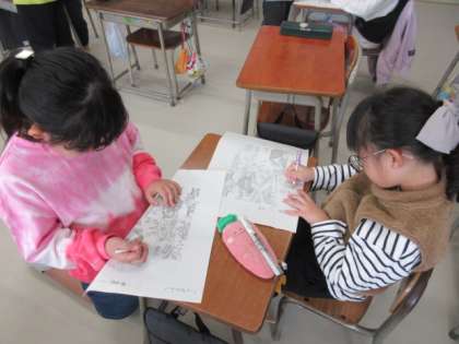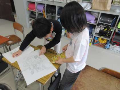 絵を見て言葉を探したり、その言葉から文章をつくる学習をしました。昔ながらの絵を見て、「これはなんだろう」と、想像を膨らませながら考える子供たちです。一人では分からないことも、友達に聞きながらたくさんの言葉を集めることができました。