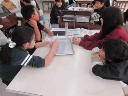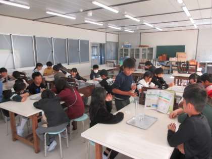 理科では、「もののとけ方」の学習をしています。もののとけ方は、水の量を増やしていくととける量も増えることが分かりました。次は、水の温度を上げてとける量の変化を見ていきます。