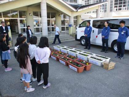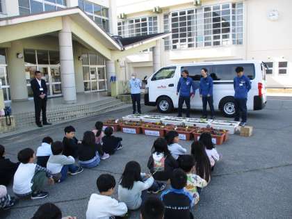 パンジーやビオラが植えられたプランターやチューリップの球根を受け取った子供たちからは、「花を大切に育てよう」「水やりがんばりたいね」との感想が聞かれました。