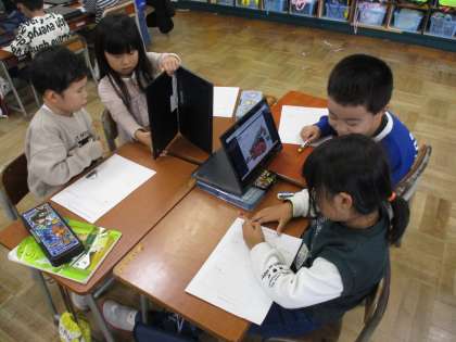 自動車の特徴を調べたり、写真を拡大して詳しく見たりしながら、自動車図鑑のページの完成を目指しています。