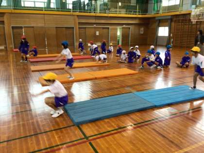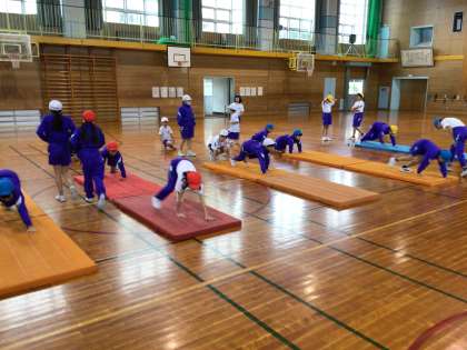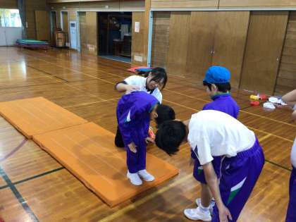 体育ではマット運動を始めました。今日は指導員の方に来ていただき、開脚前転や伸膝後転等の技のコツや練習方法を教えていただきました。教えていただいたことをもとに自分のできるようになりたい技を決めて練習していきます。