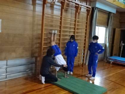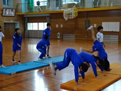 富山市スポーツ協会から指導員の先生をお招きして、マット運動を教えていただきました。美しい前転、後転のポイントや、側転や倒立のコツを教えていただきました。だんだんとできるようになり、嬉しそうな子供たちでした。