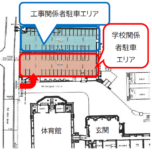 平日の日中は、学校教職員(30名弱)と工事関係者(最大30名)が駐車します。来校時、空いている箇所には駐車できます。学校開放で体育館やグラウンドを使用されるときには駐車が可能です。ただし、敷地内における事故や事件等につきましては、学校は一切責任負いかねますので、お気を付けください。