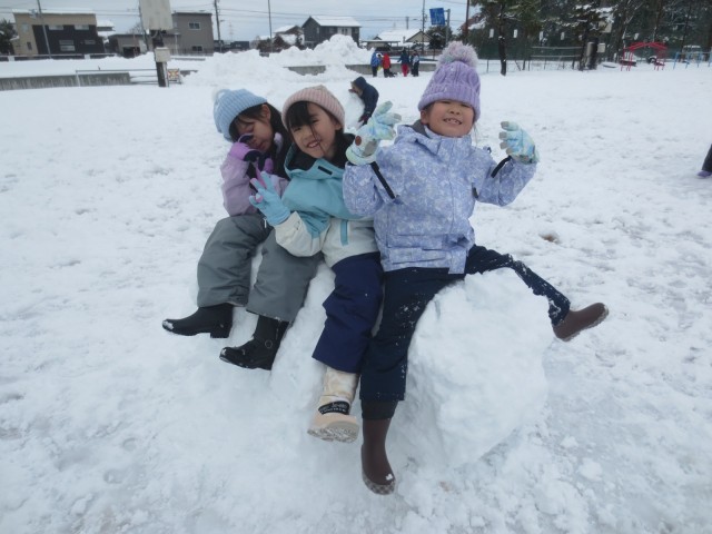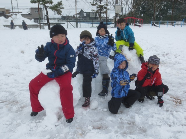 今冬、最強寒波の襲来で、昨日から降った雪が積もり、雪遊びに格好の日になりました。準備万端にしてグラウンドへ出るなり、思い思いに大きな雪の玉を作り出しました。転がしてどんどん大きくなっていくと、一人では転がせなくなり、友達と力を合わせて押していました。あちらこちらに雪玉の椅子や新幹線やバイクが出現しました。雪っ子遠足に早く行きたい思いを強くしました。