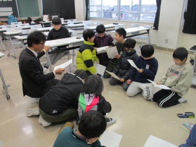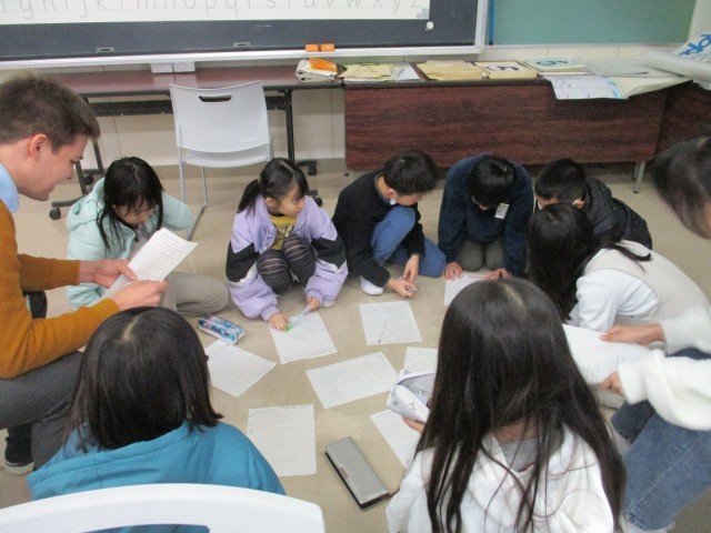 外国語活動では、小泉八雲の怪談から「むじな」と「若返りの泉」を英語で読む練習をしています。登場人物の気持ちになりきって読み方を工夫したり、英語の発音を何度も確認したりする様子が見られました。