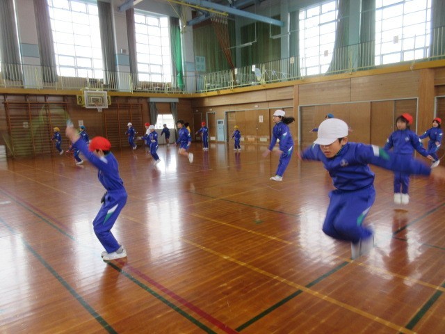 体育館で行う体育科の授業は、寒さで身体が縮こまってしまうので、ウォーミングアップになわとびの活動を取り入れています。