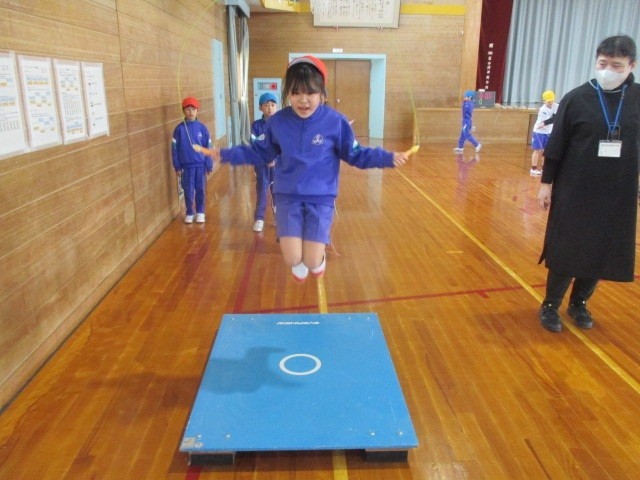 1年生の時に比べて、どれだけ跳ぶ回数が増えたのか、自分の最高記録を目指して一生懸命に取り組む子供たちです。