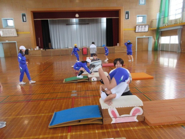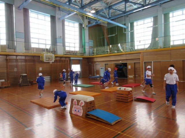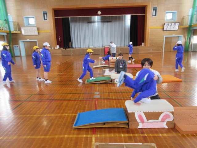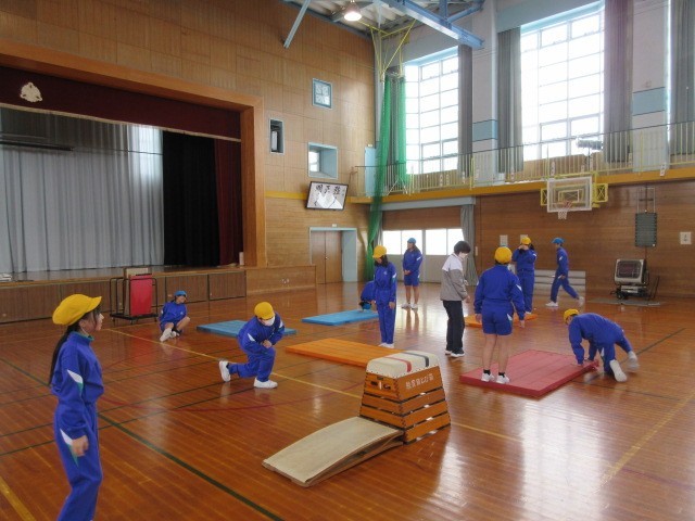 外部の指導員の方をお招きして、跳び箱運動について学習をしました。開脚跳びのポイントや台上前転のコツを中心に教えていただきました。また、発展技として、頭はね跳びの練習方法も教えてもらい、実りある学習となりました。