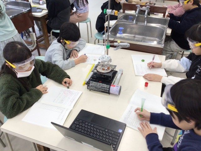理科では水のすがたと温度について学習しています。水を熱すると100℃近くで沸騰すること、沸騰すると温度が変わらなくなること等を、実験を通して確かめました。