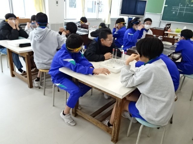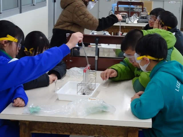 今日は鉄やアルミニウムを溶かす水溶液についての実験です。保護めがねもつけて慎重に実験を行いました。