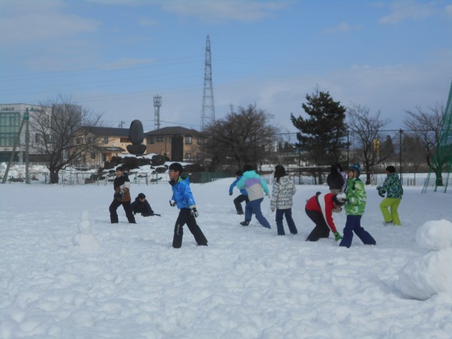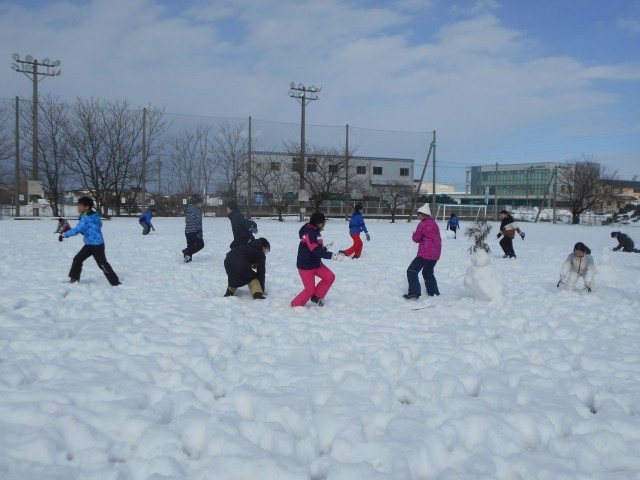 雪が積もったグラウンドで、思いっきり体を動かしました。青空の下遊ぶ子供たちはとても楽しそうでした。