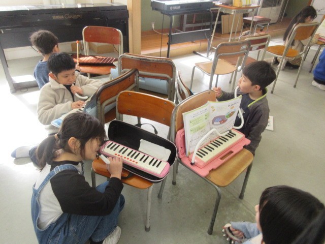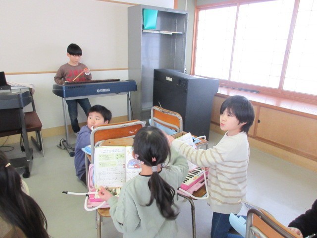 音楽科の授業では、鍵盤ハーモニカ・木琴・すずの3パートに分かれて「小ぐまの二月」の合奏練習をしています。