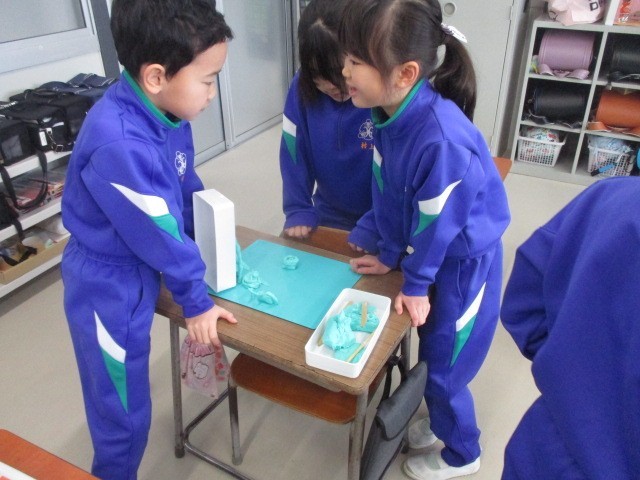 今日の図画工作の授業は「おもいでをかたちに」です。これまでの思い出を粘土で表しました。