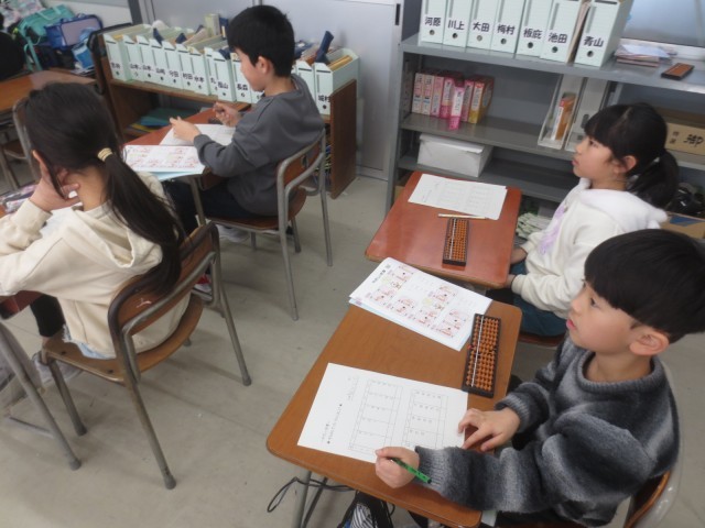 昨日と今日の2日間、講師の先生にお越しいただきそろばんの学習を行いました。初めてそろばんに触れる子も習っている子も真剣に取り組み、そろばんを用いて数を表すことをとても楽しんでいました。