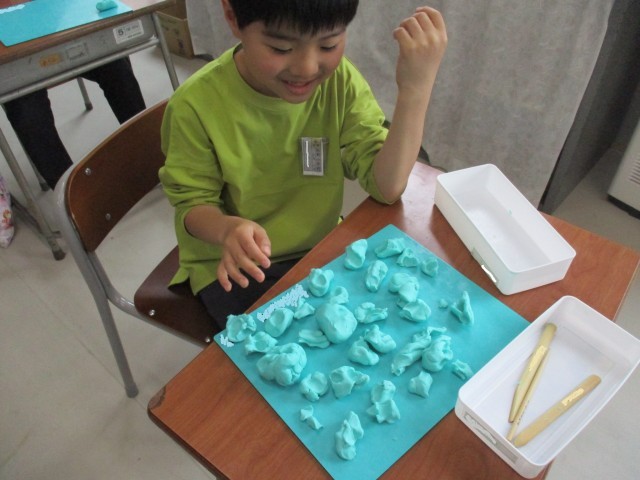 図画工作科の学習で、粘土をにぎってできた形から何に見えるか想像してイメージを広げる活動をしました。食べ物や生き物等、様々なものを想像したり、友達と何に見えるか話しながら作品を作ったりしました。