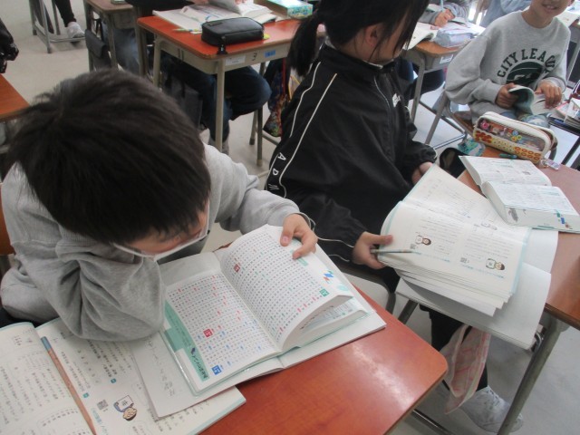 国語科では、漢字辞典を使って学習に取り組んでいます。子供達の振り返りでは、「前より辞典を引くのが早くなって、嬉しい。」や「漢字が見つかって楽しかった。」などの感想をもっていました。